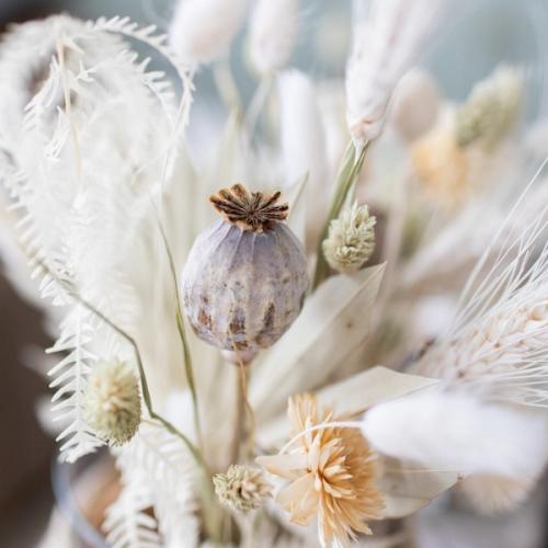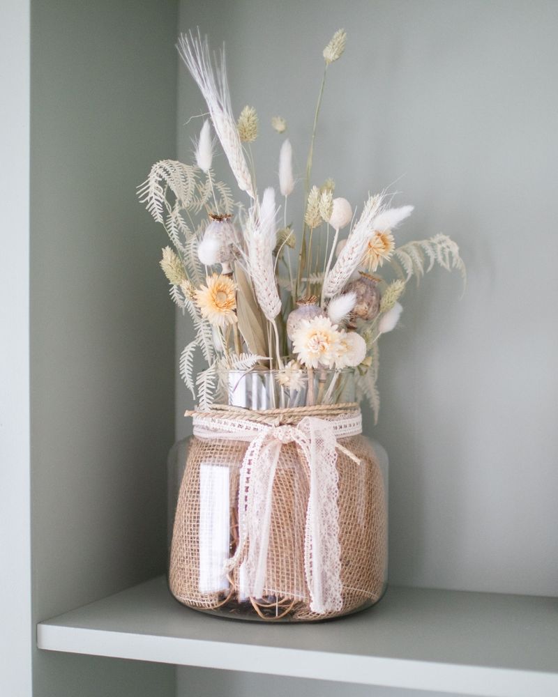 Louise vereint natürliche Eleganz und charmante Details zu einer stilvollen Tischdekoration im Boho-Stil. Die mit Jute und Spitzenband verzierte Glasvase, gefüllt mit Trockenblumen wie Schleierkraut, Lagurus und Strohblumen, bringt in warmen Naturtönen eine beruhigende und einladende Atmosphäre auf Sideboards, ins Wohnzimmer oder ins Gäste-WC.