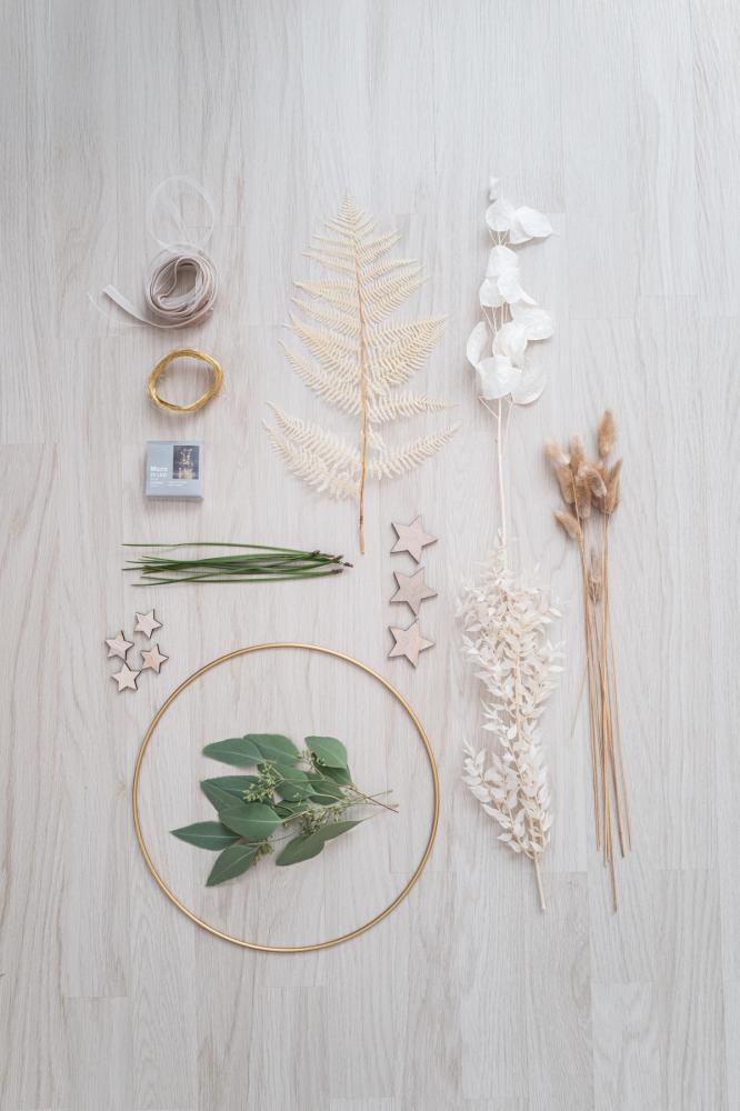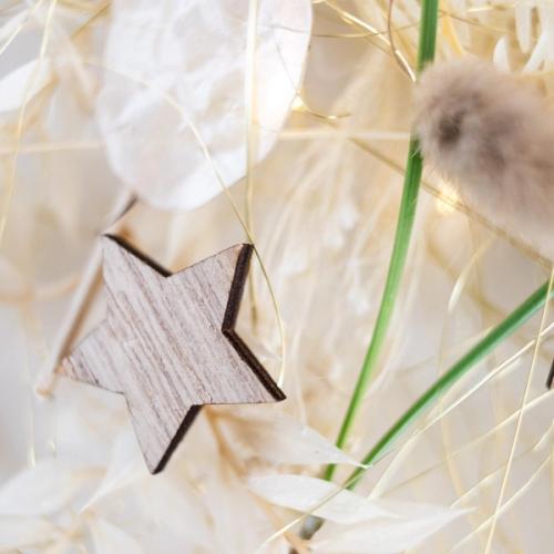 Ein filigraner Loop in warmen Gold- und Weißtönen, verziert mit zarten Trockenblumen, Naturmaterialien und kleinen Sternakzenten, der durch das sanfte Licht einer LED-Lichterkette eine stimmungsvolle Atmosphäre erzeugt. Die Kombination aus natürlichen Elementen und Lichterspiel verleiht dem Kranz eine elegante und festliche Ausstrahlung, ideal als moderne Wand- oder Fensterdekoration für die Winterzeit.