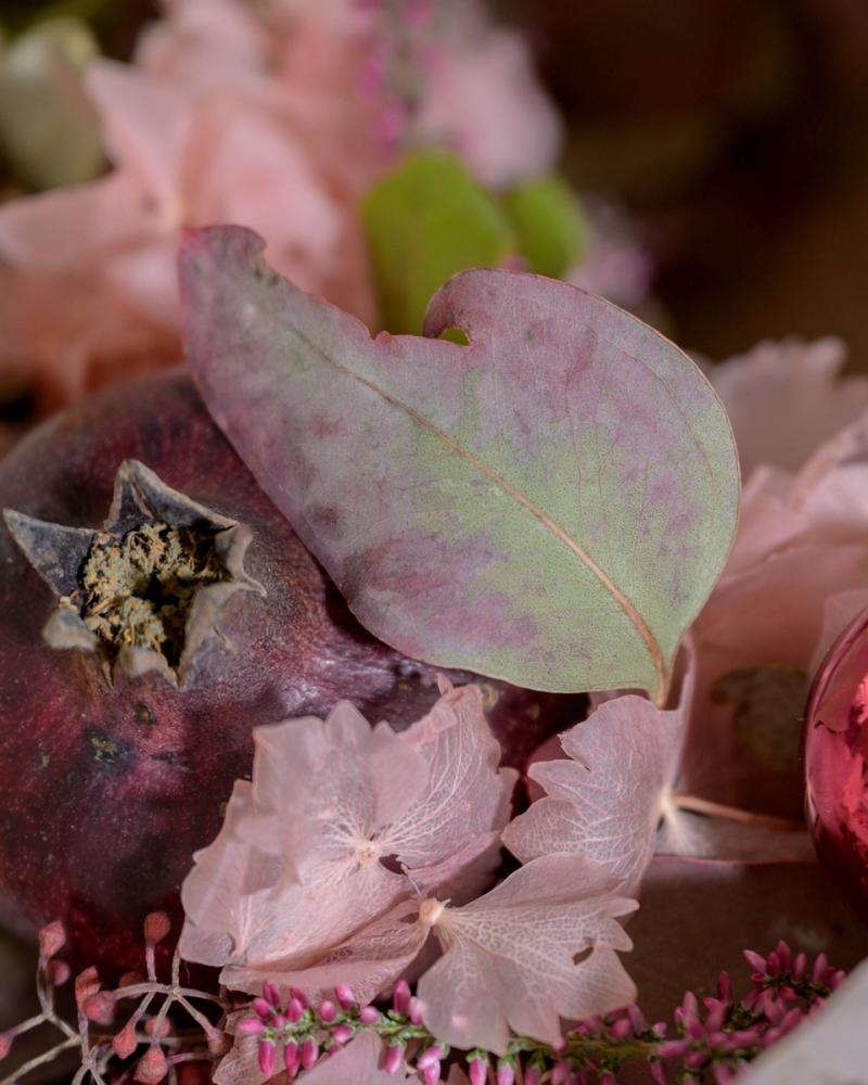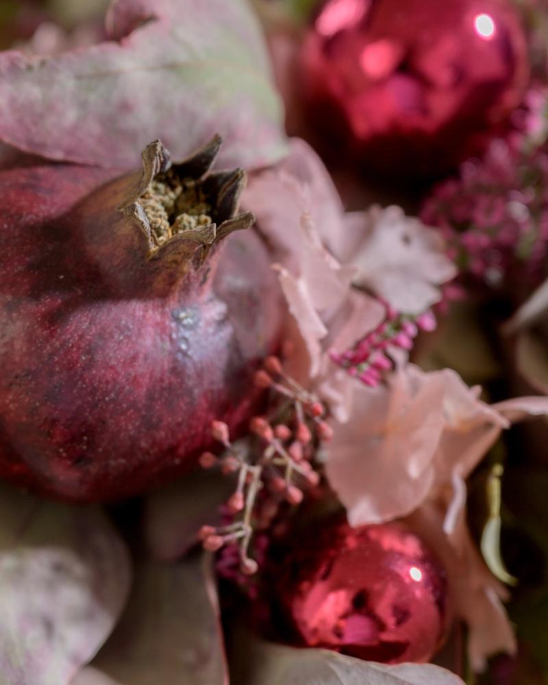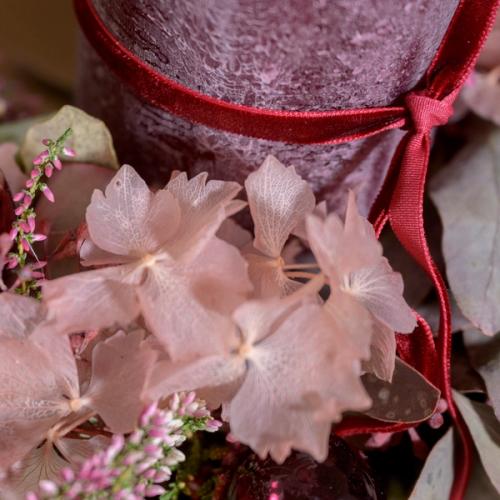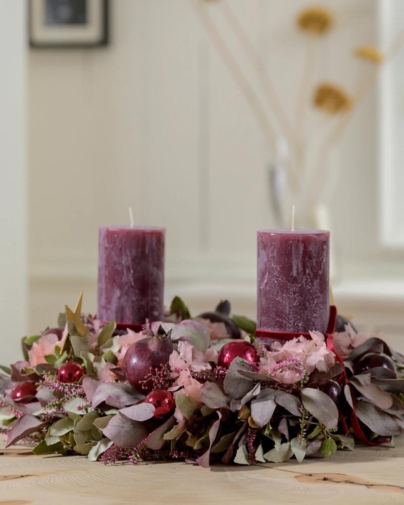 Diese adventliche Gesteck kombiniert warme Beerentöne, edle violette Stumpenkerzen und filigrane Blätter zu einem festlichen Arrangement. Mit eleganten Details wie glänzenden Kugeln und feinen Blüten bringt er einen Hauch von luxuriöser Gemütlichkeit in dein Zuhause und ist der perfekte Begleiter für die Adventszeit.
